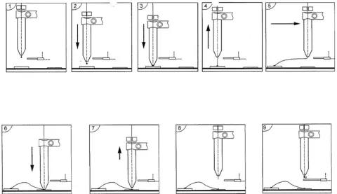 A aluminium wire is brought under the tool and then placed on the contact to be bonded. The wire is then guided by the tool on the second contact to perform the bonding.