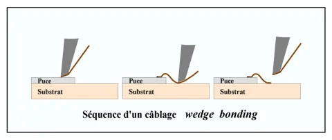 A gold wire goes through a capillary. The ball formed at the end of the capillary (by an electric discharge) is bonded on a metallic contact. The capillary is then moved to perform a “wedge�? bonding. The wire is finally removed by the capillary and a new ball is formed for the next use.