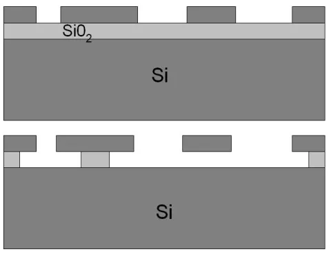 A sacrificial layer of silica (Si02), positioned under the device to release, is chemically etched in dry phase by means of hydrofluoric acid vapor (HF). Generally, the SOI wafers are used in this technology.