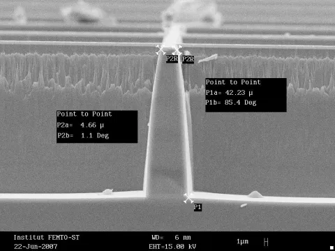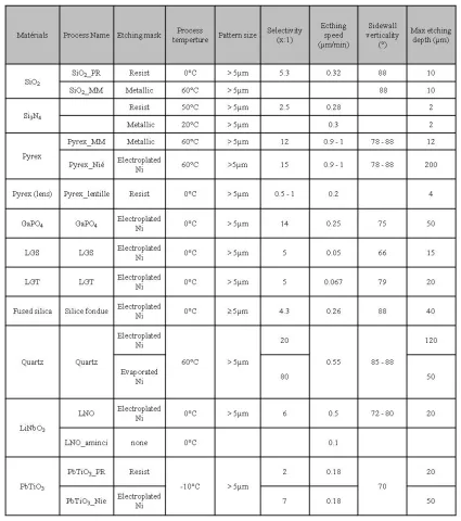 Reactive Ion Etching consists in exposing a substrate to a plasma coming from the ionization of wisely chosen gas species. In the case of deep etching, the plasma gets denser by means of inductances stimulated by signals at 13.56 MHz. This process is called ICP for “Inductance Coupled Plasma�?. In this case, it is possible to achieve higher etching speed.