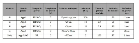 Table of etching performances :