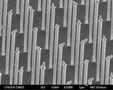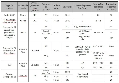Silicon can be etched in an anisotropic (or isotropic) and dry way with the technology called “deep RIE�?. This method combines deposition and etching plasma assisted processes. While the silicon is etched, the process enables to deposit a fluorinated component on the pattern walls in order to passivate them. Etching-deposition cycles with given gases and time enable to etch deeply and anisotropically the silicon independently of its orientation.